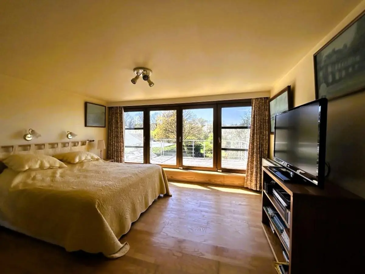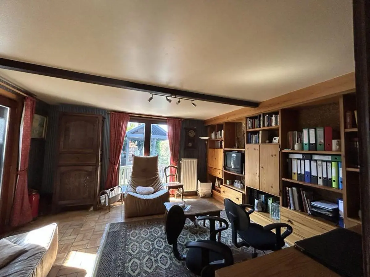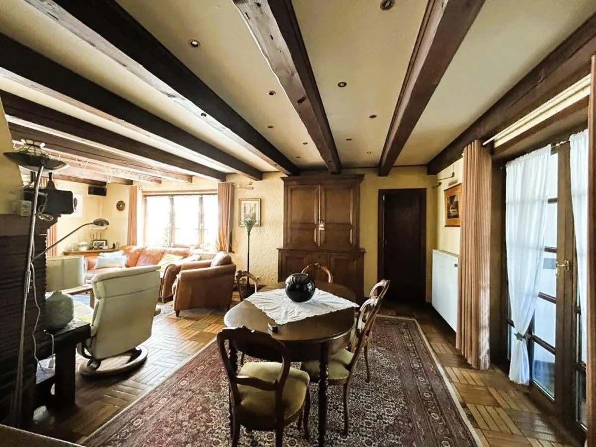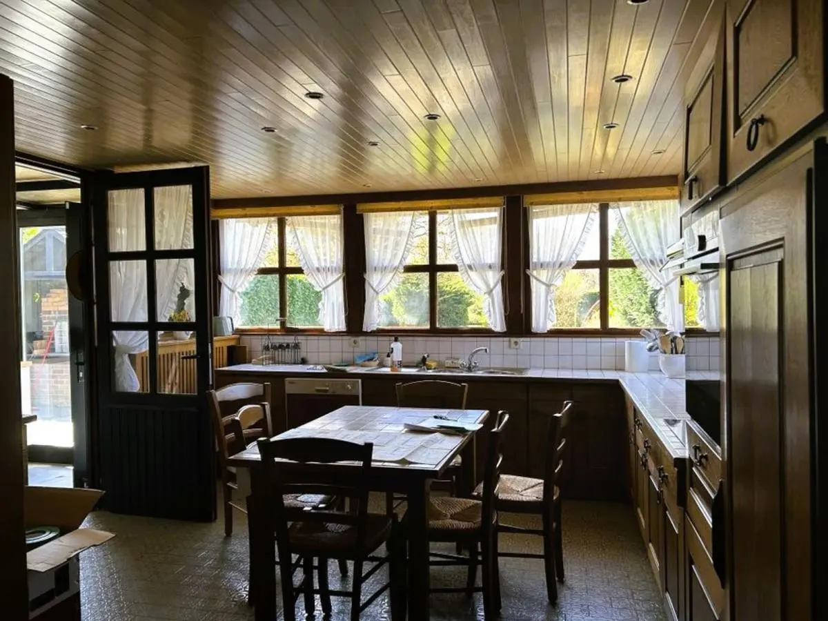 En voici la composition: 2 caves dont une chaufferie + un garage carrelé. Le rez-de-chaussée se compose d’un hall d’entrée avec placards en chêne, WC séparé avec lave mains, chambre ou bureau +/- 18M2 avec porte latérale (possibilité de profession libérale ou autre) et porte-fenêtre donnant sur la terrasse, superbe pièce de séjour +/-38M2 avec K7 au bois, 1 vaste cuisine équipée en chêne massif +/-25M2, 1 véranda, hall de nuit, 1 chambre +/- 12M2, 1 salle de douche avec lavabo et douche +1 petite salle de bains, 1 pièce dressing ou petite chambre +/-9M2. A l’étage : magnifique chambre +/- 25M2 +placards + combles + terrasse en bois surplombant la propriété.