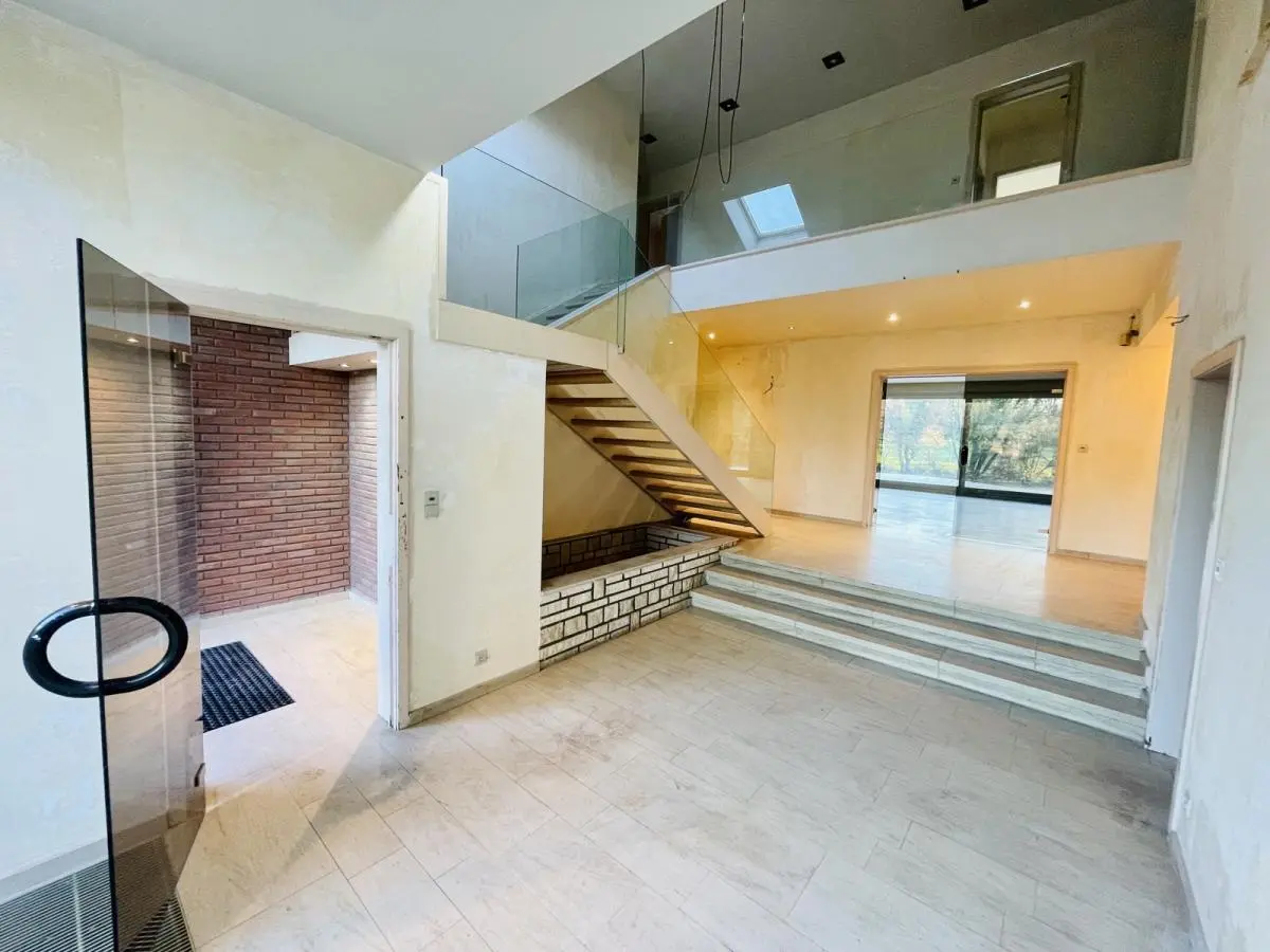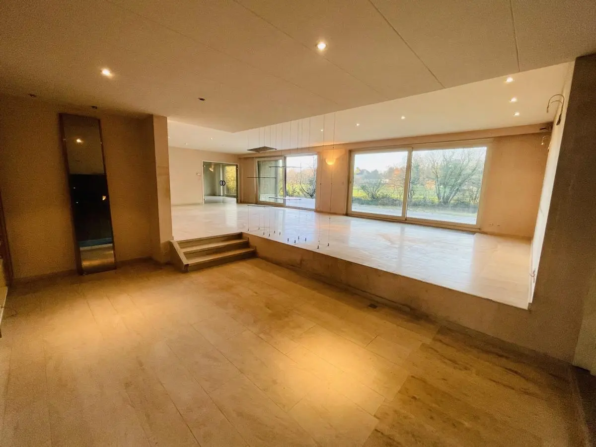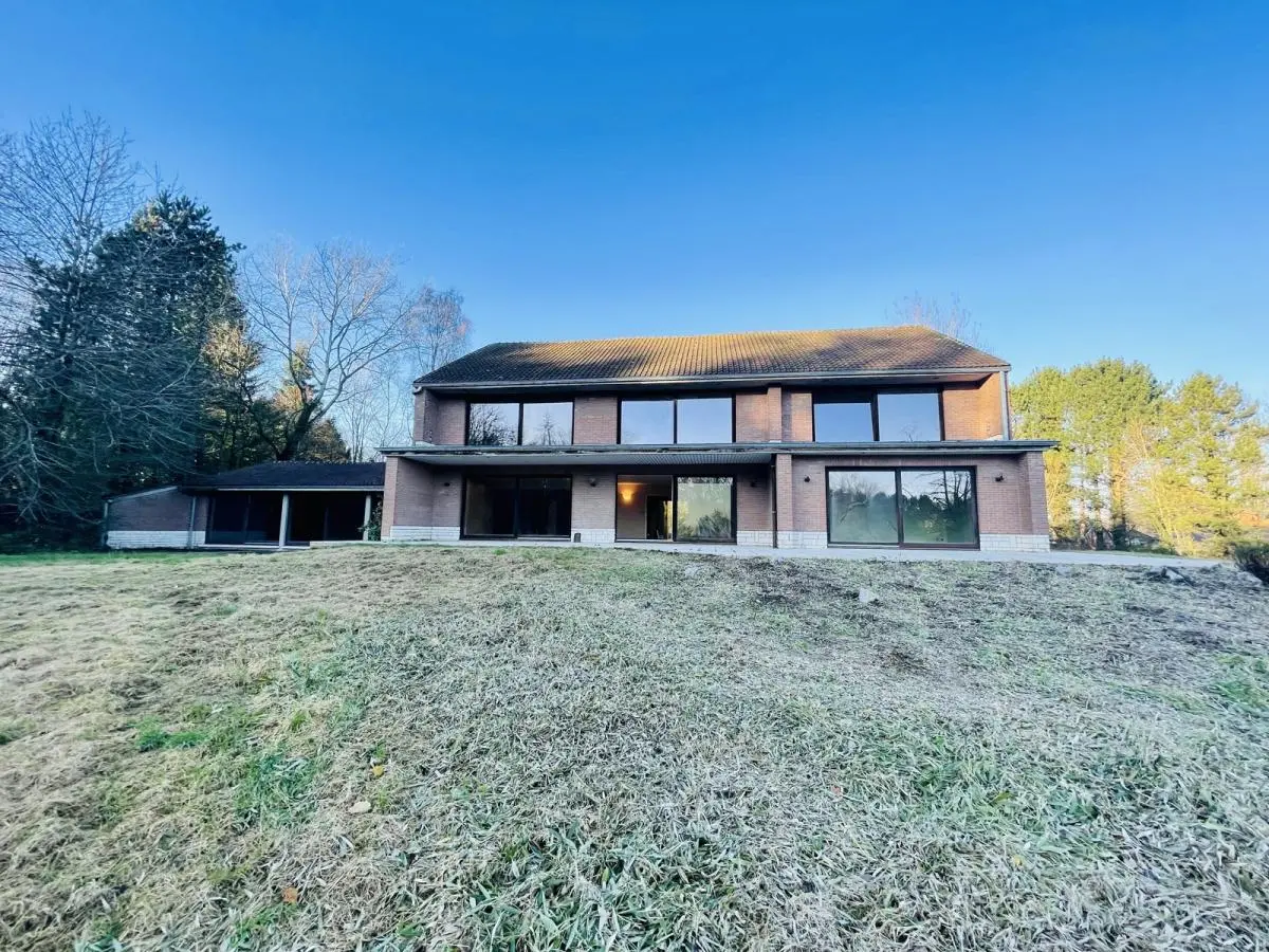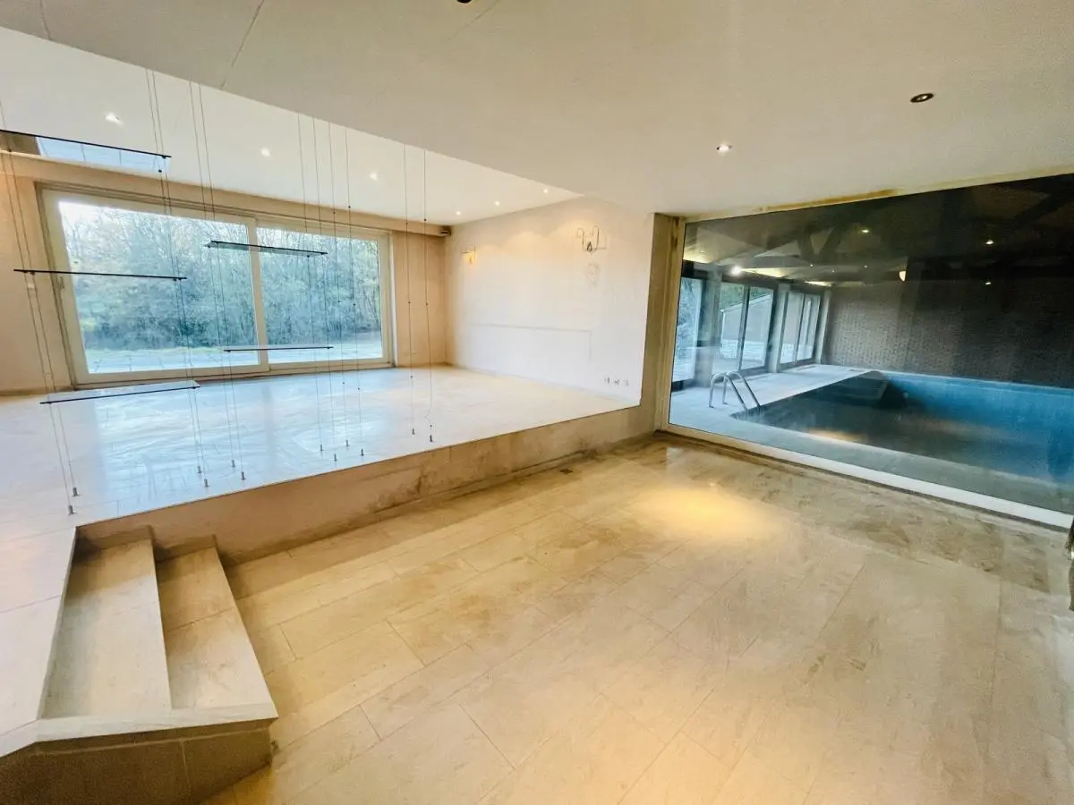 L’accès se fait par un passage latéral qui nous mène vers un grand parking. L’entrée dispose d’un hall majestueux donnant sur un séjour de 78m2 composé de 2 grandes baies vitrées. Coin salon hiver avec cheminée offrant une vue sur la piscine intérieure grâce á une grande baie vitrée. Le séjour mène vers la salle à manger séparée d’une superficie de 25 m2 disposant également d’une baie vitrée. Terrasse en pierre naturelle isolée du vent et du soleil grâce à sa couverture. Très grande cuisine d’une surface de 35m2 se situant derrière la SAM. Bureau de 24m2. Piscine intérieure de 10mX5m. Vestiaire avec douche, toilette. Double garage. (superficie de +/- 300m2). L’étage (superficie de 200m2) comprend 5 chambres dont 4 sont des suites ! Suite parentale de 50 m2, chambre 30m2 et spacieuse SDB. Baie vitrée donnant sur balcon partagé par 3 chambres. Les 2 autres suites côté sud de 24m2 avec SDB. Chambre d’amis de 20m2 avec bain et débarras. 5ème chambre/studio avec feu ouvert de 24m2. Grenier et cave sur toute la superficie de la villa, soit un total de +/- 900m2. Chaudière au mazout. Système de chauffage à air pulsé pour la piscine. Toiture en bon état, maison saine. Enveloppe travaux à prévoir. Perle rare