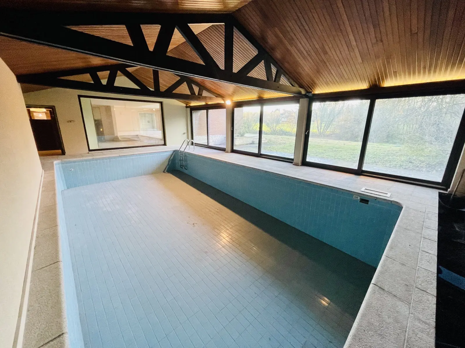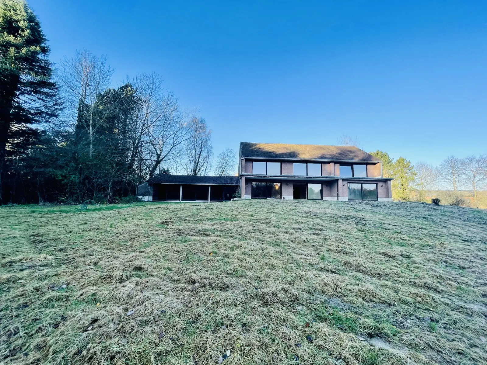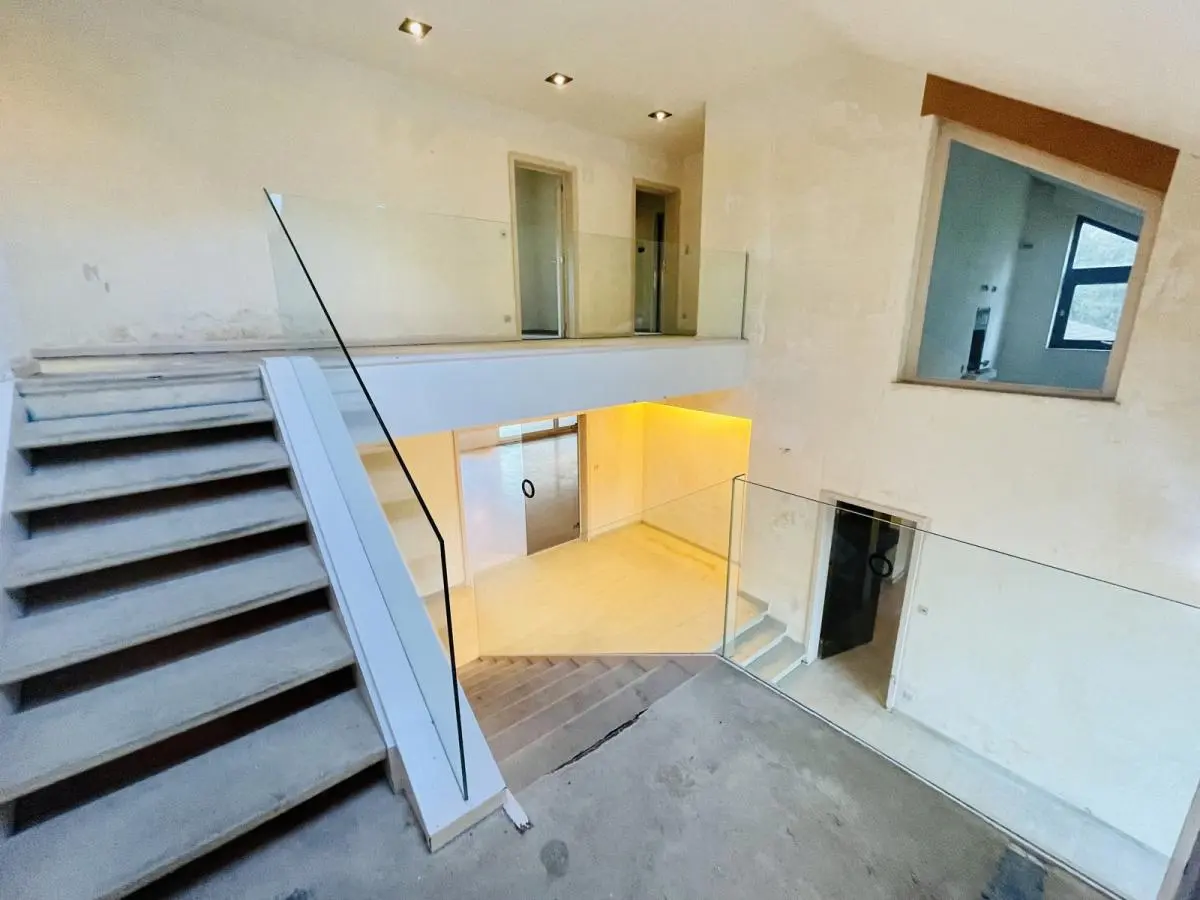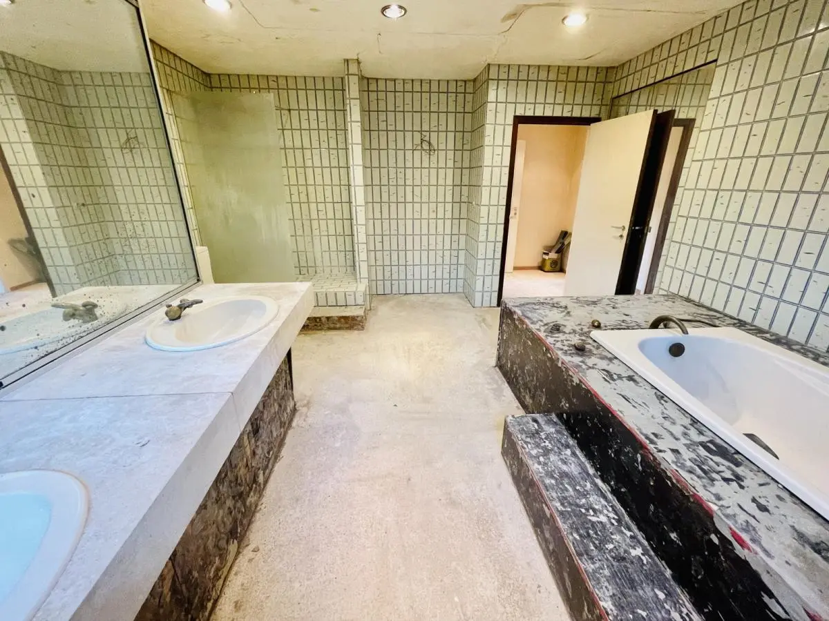 L’accès se fait par un passage latéral qui nous mène vers un grand parking. L’entrée dispose d’un hall majestueux donnant sur un séjour de 78m2 composé de 2 grandes baies vitrées. Coin salon hiver avec cheminée offrant une vue sur la piscine intérieure grâce á une grande baie vitrée. Le séjour mène vers la salle à manger séparée d’une superficie de 25 m2 disposant également d’une baie vitrée. Terrasse en pierre naturelle isolée du vent et du soleil grâce à sa couverture. Très grande cuisine d’une surface de 35m2 se situant derrière la SAM. Bureau de 24m2. Piscine intérieure de 10mX5m. Vestiaire avec douche, toilette. Double garage. (superficie de +/- 300m2). L’étage (superficie de 200m2) comprend 5 chambres dont 4 sont des suites ! Suite parentale de 50 m2, chambre 30m2 et spacieuse SDB. Baie vitrée donnant sur balcon partagé par 3 chambres. Les 2 autres suites côté sud de 24m2 avec SDB. Chambre d’amis de 20m2 avec bain et débarras. 5ème chambre/studio avec feu ouvert de 24m2. Grenier et cave sur toute la superficie de la villa, soit un total de +/- 900m2. Chaudière au mazout. Système de chauffage à air pulsé pour la piscine. Toiture en bon état, maison saine. Enveloppe travaux à prévoir. Perle rare