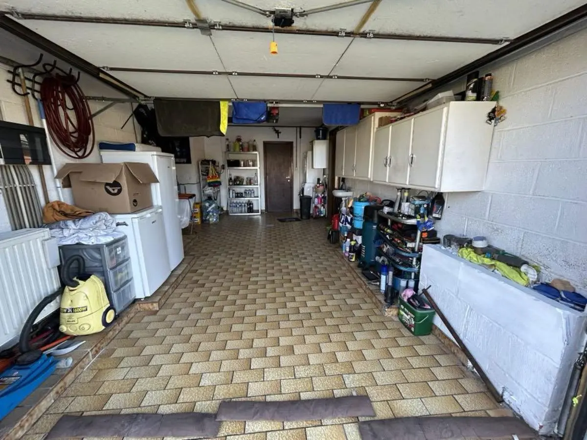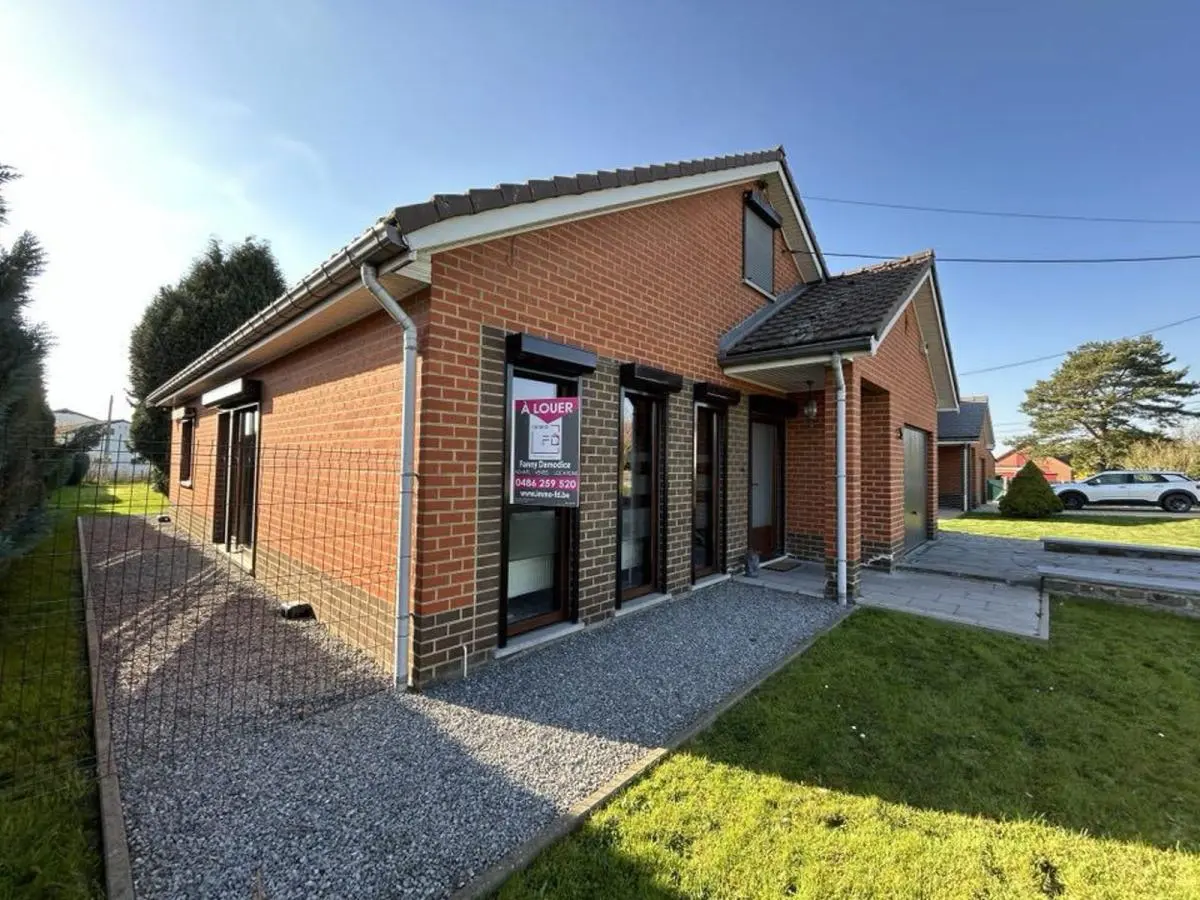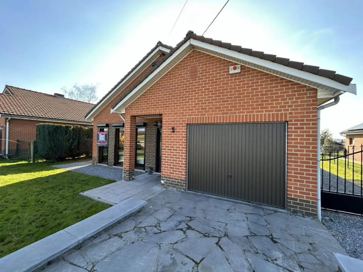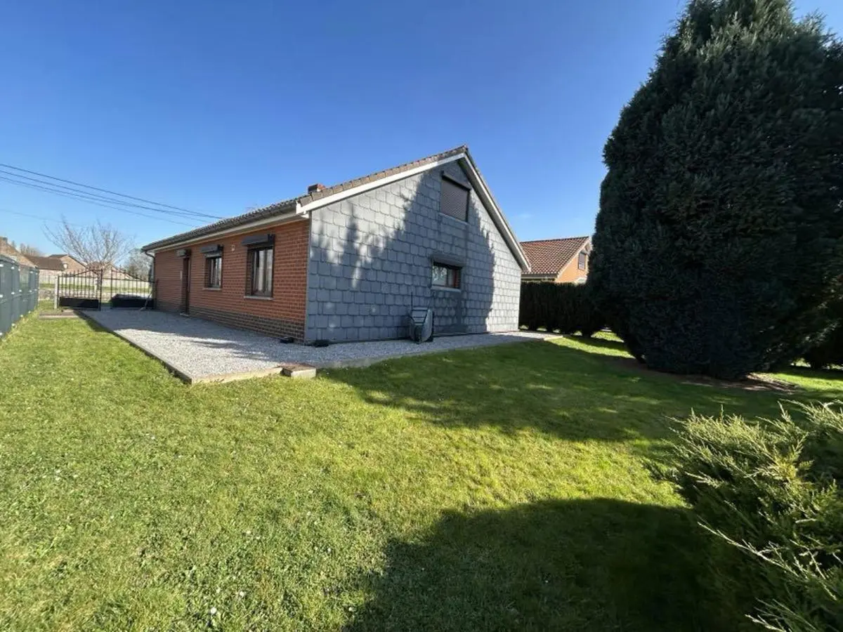 En voici la composition: Hall d'entrée, pièce de séjour +/- 42M2, cuisine équipée composée d'un four frigo, plaque vitro hotte et double évier, hall de nuit, 2 chambres ( +/- 14M2, 12M2), salle de douche avec WC, grand garage avec espace buanderie. Equipements: Chauffage Central Gaz, volets manuels et électriques Châssis PVC DV, Electricité compteur bi-horaire. Parking à l'avant. PEB Classé E N°20160817001447 Cons d'énergie primaire: 351KWH.M2/AN. Surface habitable : +/- 100M2.