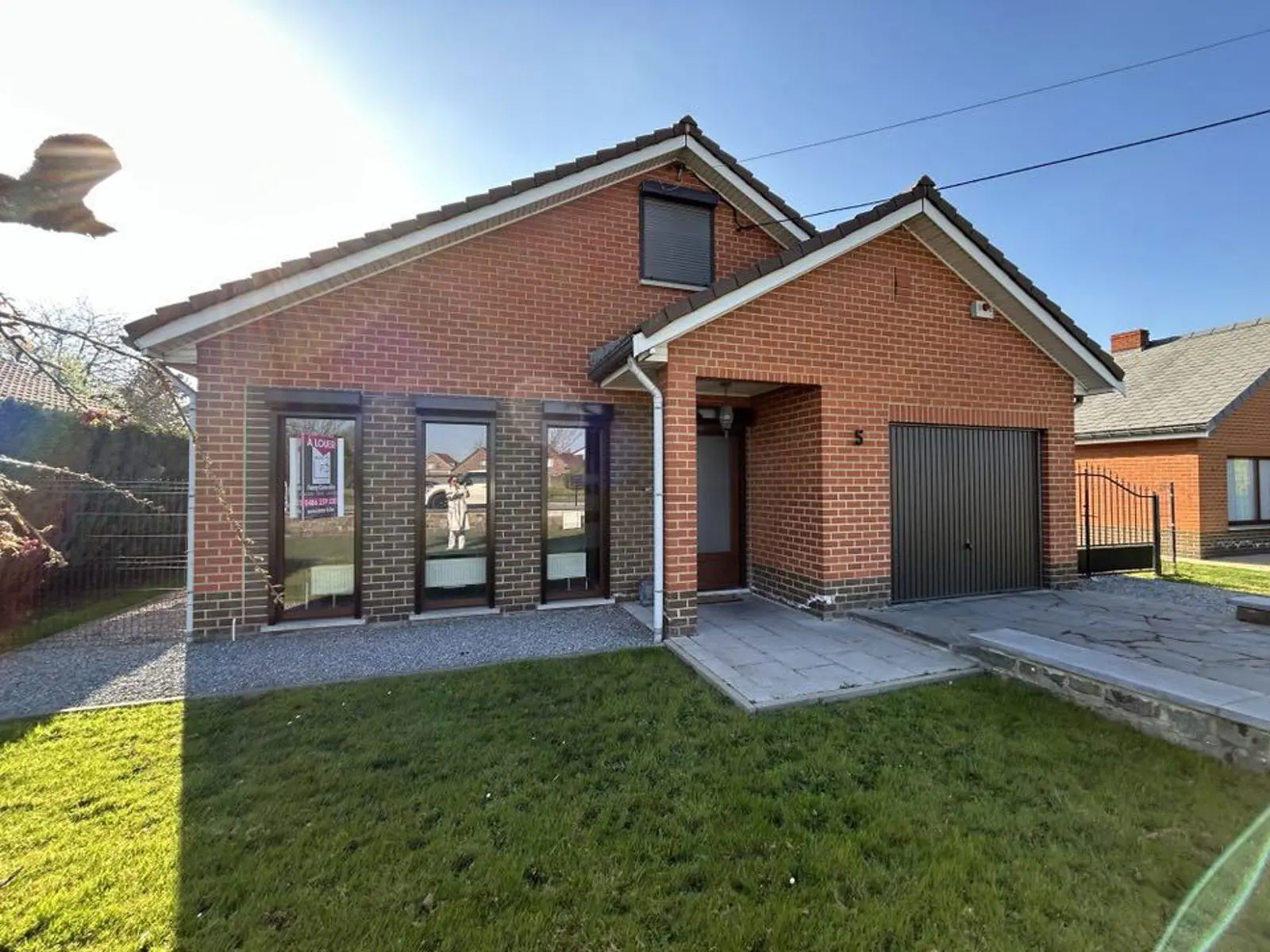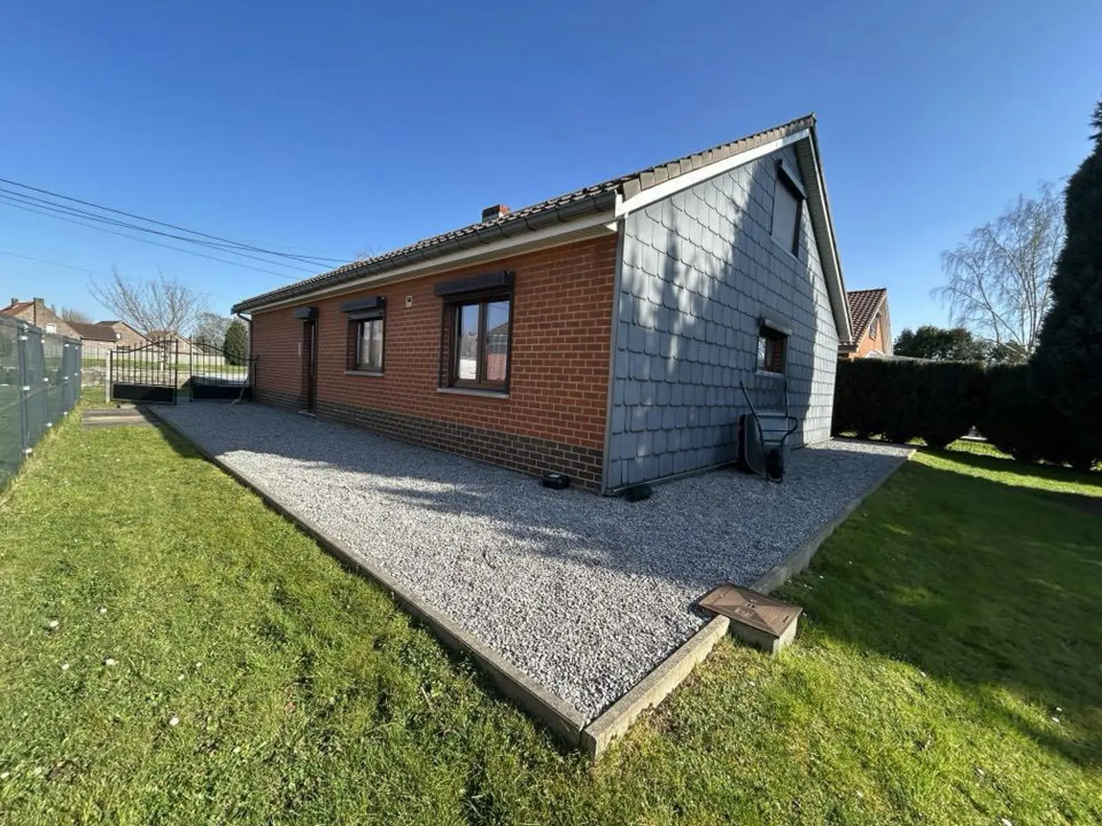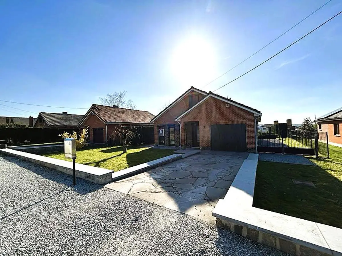 En voici la composition: Hall d'entrée, pièce de séjour +/- 42M2, cuisine équipée composée d'un four frigo, plaque vitro hotte et double évier, hall de nuit, 2 chambres ( +/- 14M2, 12M2), salle de douche avec WC, grand garage avec espace buanderie. Equipements: Chauffage Central Gaz, volets manuels et électriques Châssis PVC DV, Electricité compteur bi-horaire. Parking à l'avant. PEB Classé E N°20160817001447 Cons d'énergie primaire: 351KWH.M2/AN. Surface habitable : +/- 100M2.