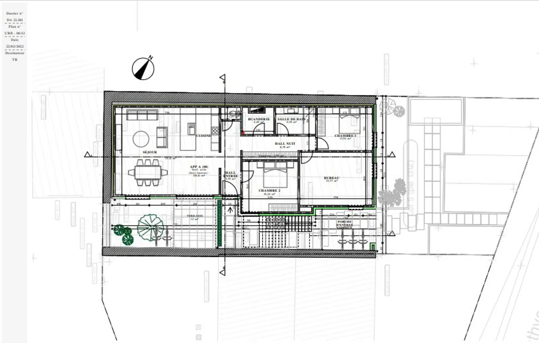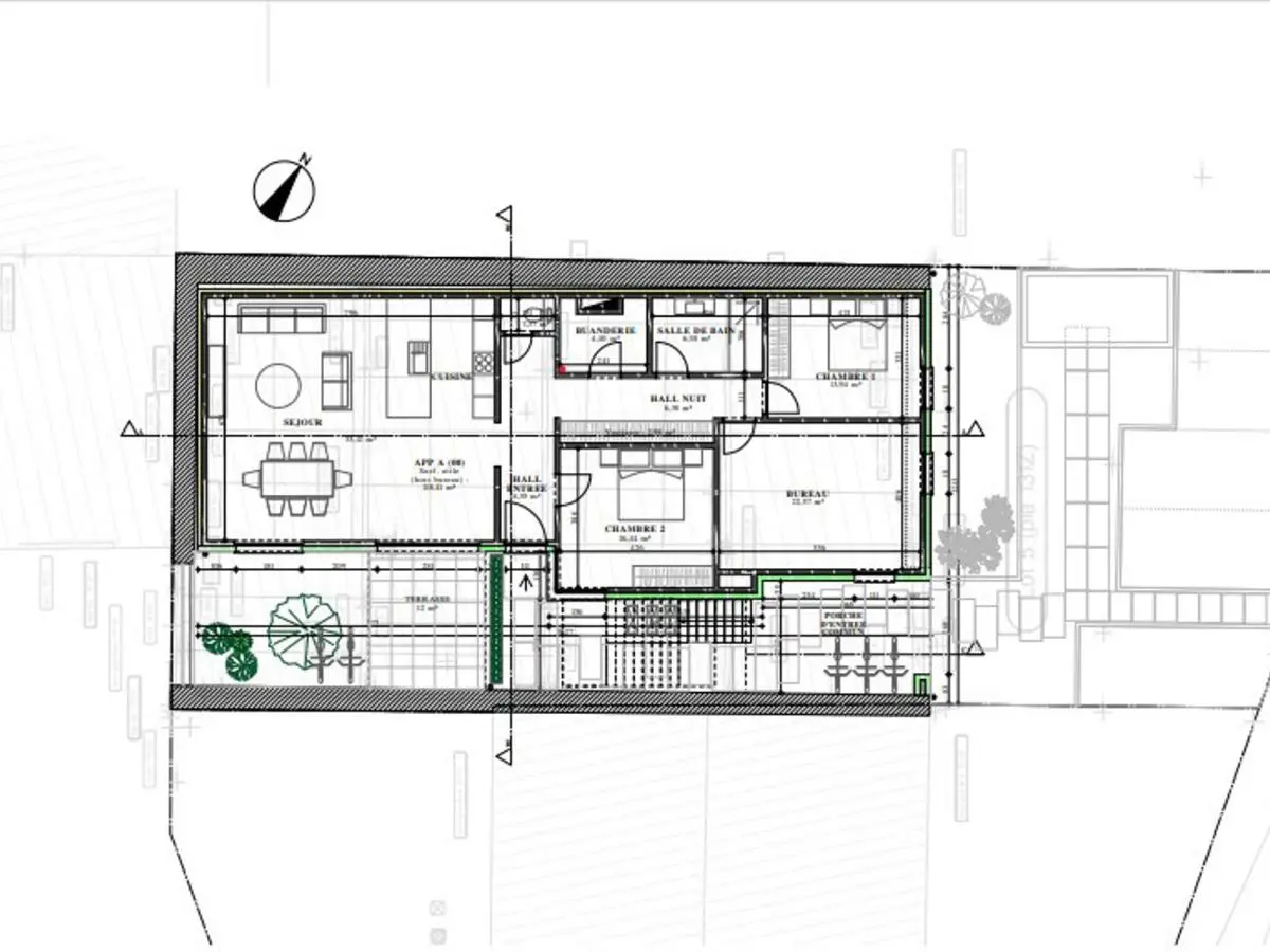 En voici la composition : Appartement Rez-de-chaussée : (34-B-1) : Hall d’entrée, superbe pièce de séjour +/- 57M2 avec grande baie vitrée donnant sur la terrasse, espace cuisine ouverte à équiper, 1 WC séparé, 1 buanderie, Hall de nuit, 1 pièce salle de douche italienne, 1 chambre ou bureau +/- 22M2, 1 chambre +/- 17M2, 1 chambre +/- 14M2. 1 belle et grande terrasse. Surface habitable +/- 147 M2. Au niveau des extérieurs: Belle vaste terrasse, 1 place de parking et demi + 1 autre local commun à l’extérieur.